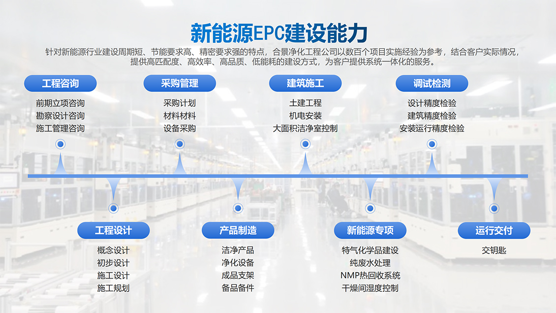 合景智慧建設是工業(yè)高端制造領域生產(chǎn)車間建設高潔凈度和低露點凈化車間內裝工程的規(guī)劃、設計、采購、施工與服務一體化總承包商,多年來,在大型廠房建設方面積累了大量豐富的低凈化車間內裝工程設計和施工經(jīng)驗,特別是在產(chǎn)能規(guī)劃、公用工程、環(huán)境工程(溫度、低露點、高潔凈度)等領域的制造、工藝流程、節(jié)能環(huán)保等提供完善的系統(tǒng)集成工程建設解決方案。